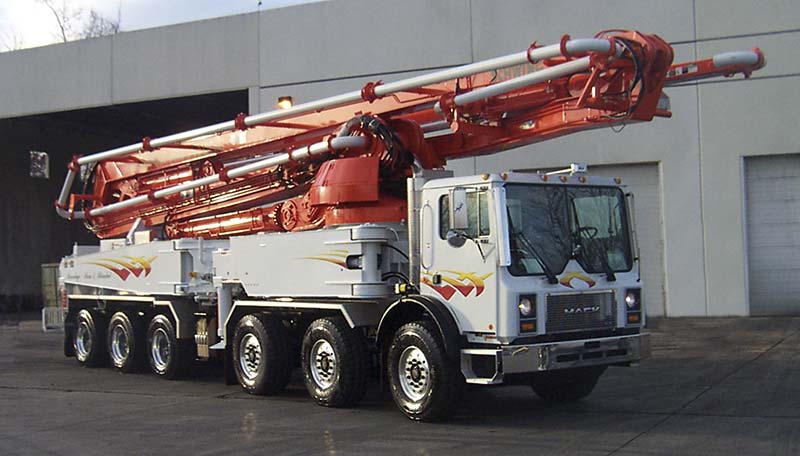 The Schwing 55M Truck-Mounted Concrete Pump features a 167' horizontal reach.