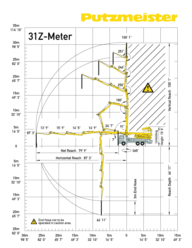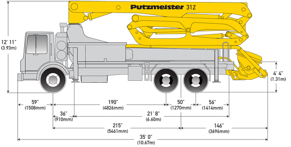 The Putzmeister 31Z Truck-Mounted Concrete Pump features a 4-section placing boom with a 79′ 9″ net horizontal reach.