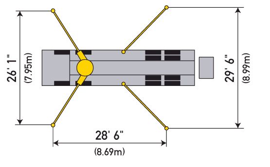 | Outrigger spread: L-R-rear hydraulically swing out & extend 29′ 6″ (8.99m) down |