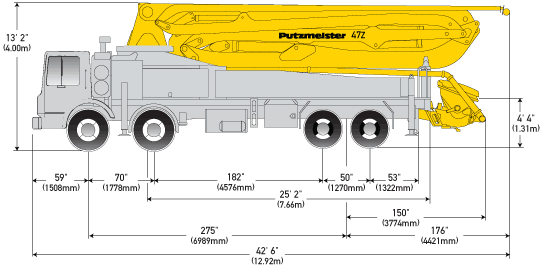 The Putzmeister 47Z Truck-Mounted Concrete Pump features a 4-section placing boom with a 128′ 2″ net horizontal reach.