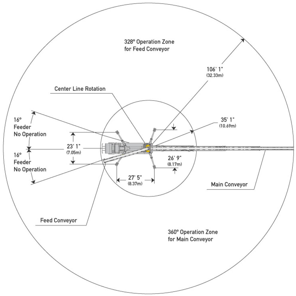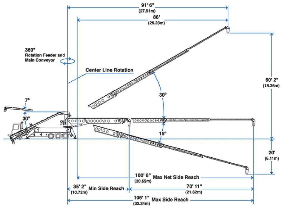 | Conveyor horizontal reach: maximum at 0° | 106’ 1″ | 32.34m |