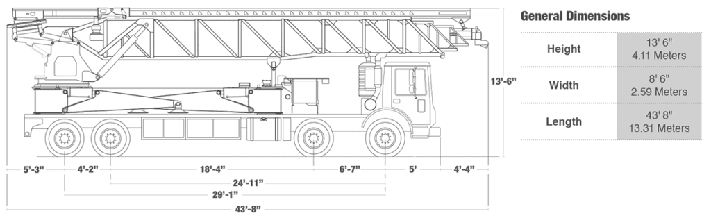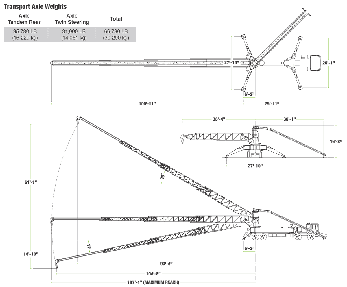 Net reach beyond outriggers Maximum at 0° 100′ 11″ 30.76 m Maximum at 30° 87′ 2″ 26.57 m Outrigger spread L-R front hydraulic out 26′ 1″ 7.95 m Outrigger spread L-R rear hydraulic out 27′ 10″ 8.48 m Outrigger spread front to rear 29′ 11″ 9.12 m