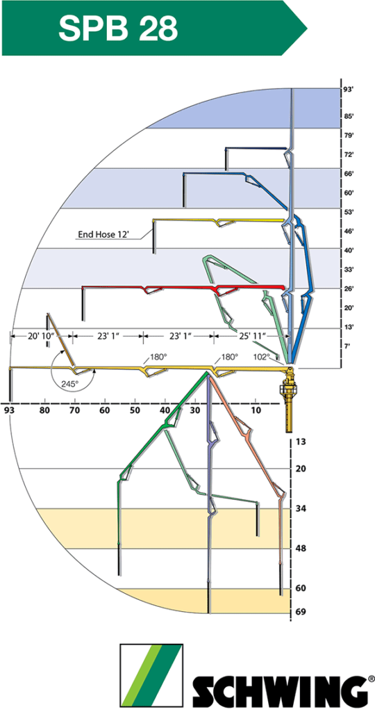 The Schwing SPB 28 is a full articulation, Roll & Fold® design 4-section boom that reaches 93′ and rotates 370 degrees.